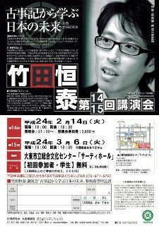 3月の大阪竹田研究会は、3月6日(火)です。 竹田恒泰氏の講演会で、前半は今月のお題(まだ未定)をテーマに、後半は今年1,300年を迎えた『古事記』の現代語訳を読みます。 当日、午後6時30分開演となり、場所は、大東市総合文化センターです。 初参加の方は、参加費が無料ですから、一度来てみてください(^o^)/