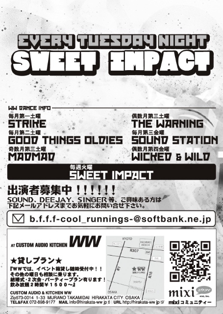 告知失礼します!! 枚方のラガスポット。【WW】で 毎週(火)曜日開催している【SWEET IMPACT】! OldからBrand New。R&B,Hip Hop,Soulなど 幅広いセレクションで、もちろんTill Morning!! ノンストップでガッツリ楽しめます♪ ◆◇◆◇◆◇◆◇◆◇◆◇◆◇◆◇◆◇◆◇◆◇◆◇◆◇◆◇◆◇ ◆3月6日はDeejay Night!! Guest Deejayには音の発明家【EJISON】!! 堺から世界へ、【RIBERO】!! もちろんRUB A DUB OPEN MICなんで 歌い手の方はガンガンMICとりにきてください♪ ◆3月13日は