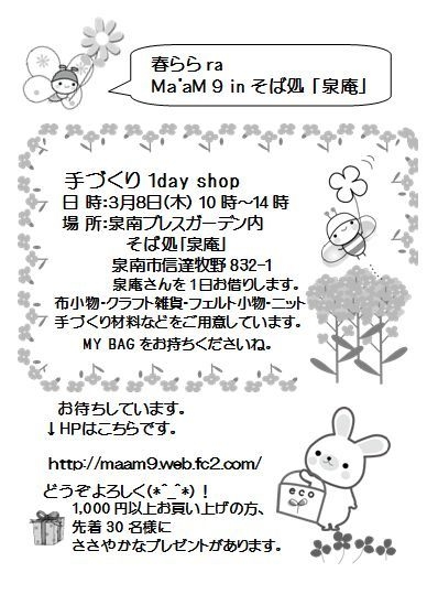 いつもお世話になります。 3月に入り、子どもたちも一つ大きくなられますね。 イベント紹介をさせて頂きます。 子どもたちが幼稚園や学校へ行った後、 手作り小物・バッグ・ニットなどを見て楽しんでください。 新学期用品も用意させて頂きました。 お気に入りの物が見つかったらうれしいです 日時:3月8日木曜日(10〜14時) 場所:泉南市信達牧野 泉南ブレスガーデン内そば処「泉庵」さんにて HPはこちらです。 http://maam9.web.fc2.com/ 1日だけの催しですがよろしくお願いしま