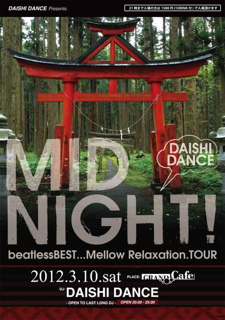 DAISHI DANCE Presents MID NIGHT! @ GRAND Cafe - beatlessBEST...Mellow Relaxation.TOUR - DATE: 3月10日(土) [NIGHT] TIME: 20:00 ~ 01:00 PRICE: 3,000YEN/W1D 21時までに入場の方は1500YEN/1D GENRE: House ARTISTS: ■DJ■ DAISHI DANCE(LONG DJ SET) http://grandcafeosaka.com/venue/flyer/101445