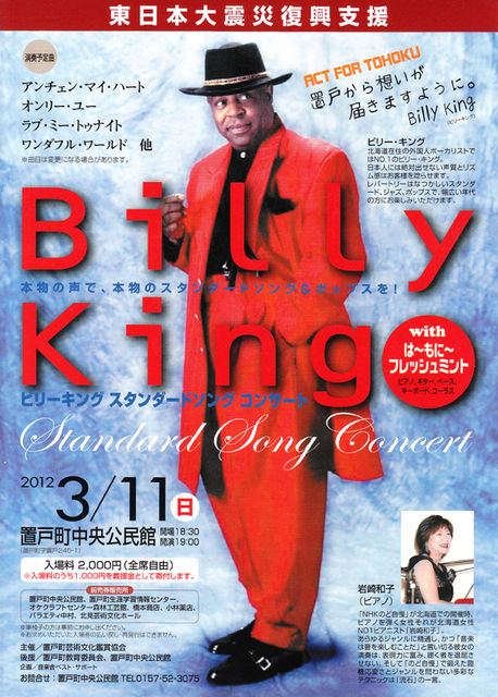 北海道在住の外国人ボーカリストではNO.1のビリーキング。 日本人には絶対出せない声質とリズム感はお客様を唸らせます。 レパートリーは懐かしのスタンダード・ジャズ、ポップスで、幅広い年代の方にお楽しみいただけます。 東日本大震災復興支援 ビリー・キング スタンダードソングコンサート 平成24年3月11日(日) 18:30開場 19:00開演 置戸町中央公民館(0157-52-3075) 全席自由2,000円(うち1,000円を義援金として寄付します) 詳細は↓ http://www.town.oketo.hokkaido.jp/okemain/s