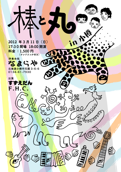 すずえだんは アコーデヨンと歌・すずえだすずえちゃんとウクレレとコーラス・横井まうさんの愉快ユニットです。 すずえちゃんは これまで何度もなまらやを笑いと興奮に巻き込んだジャバラでお馴染みですね。 まうさんは 近頃話題のふしぎバンド・ぷぅをひきいるリーダーでありますが、かつて知っている人は知っているホレデリックサーカスという魅惑のバンドのリーダーでもありました。 ふたりとも絵を書くし、多彩ユニットです。そんなわけでフライヤーがこんなことに。 FHC。 チャップマンスティックのかさいあつしさんとバスメロディ