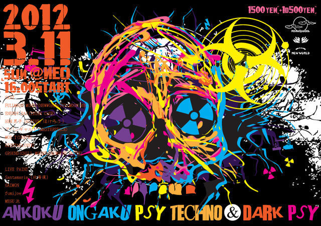 暗黒音楽祭 TECHNO&DARK PSY 2012年03月11日(日) @NEO(OSAKA) 16:00 START! 1500yen(+1D.500yen) CAST FULLMOON MONDO(NEWWORLD/FULLMOON REC.) ENERDY DAI(TEION CLUB) HEN男子(ACTIVE/ホロケウ) アバンギャルド(MASTERPEACE) MOE:T(SNIPE) HIDETAKA(NYX) GROUND(CHILL MOUNTAIN/MOUNT HUTTE) LIVE PAINT Santamaria(北海道) GAIMON fumijoe MEGU汰