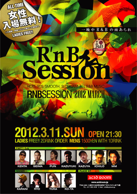 2012年3月11日(日) 開催 ! 『RnB Session』 ACID ROOMで7年続く R&B PARTY "朝まで一晩中R&Bの雨あられ!" 【キャンドルナイト】 今回は、東日本大震災の発生から1年を迎える日。 昨年の3月のRnB Sessionも店内照明を キャンドルに変えて開催しました。 震災から1年。『忘れない』という想いもこめ、 再び店内照明をキャンドルに変えて開催してみます。 ★女性入場無料 ※入場時別途2drink購入制 ★先着100名の女性にクッキーをプレゼント ◆◆◆◆◆◆◆◆◆◆◆◆◆◆◆◆◆◆◆