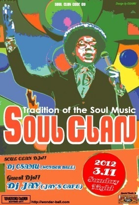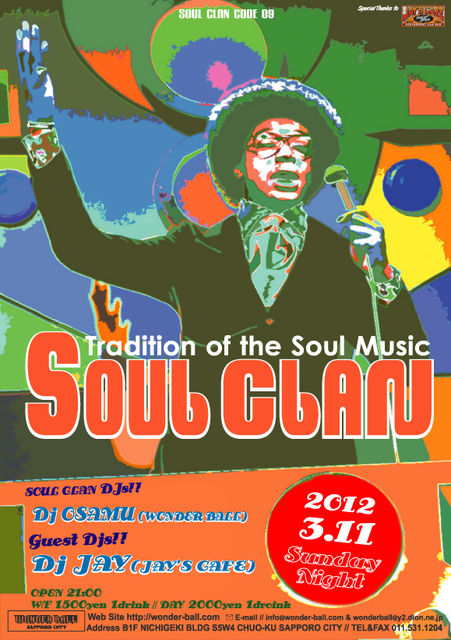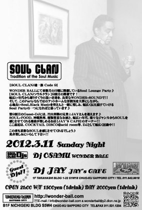 2012.3.11.Sunday Night Tradition of the Soul Music【SOUL CLAN/魂一族 code 9】 ☆SOUL CLAN DJs ... DJ OSAMU WONDER BALL ☆GUEST-DJ DJ JAY from JAY'S CAFE WONDER BALL/OPEN 21:00〜 [W/F] 1500yen + 1Drink [DAY] 2000yen + 1Drink [Address] B1F NICHIGEKI BLDG S5W4 CHUO-KU SAPPORO CITY HOKKAIDOU JAPAN [WEB SITE] http://wonder-ball.com/ 【SOUL CLAN/魂一族】奇数月/第2日曜日開催 WONDER BALLにて開催しているSoul Lounge Party 【SOUL CLAN/ソウルクラン】9回目の開催です! 今回のGUEST-DJには、