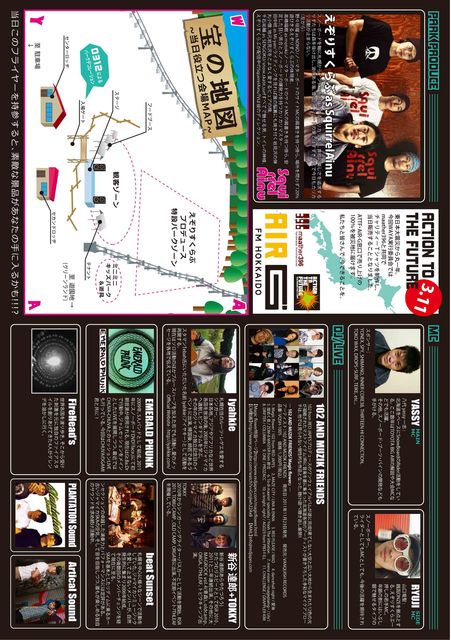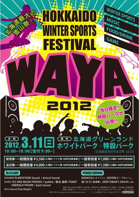 WINTER SPORTS FESTIVAL WAYA 2012 【日時】 2012.3.11(SUN)10:00〜18:00(受付9:00〜) 【場所】 北海道岩見沢市志文町1056 北海道グリーンランド特設パーク 【主催】 WAYA実行委員会 【後援】 北海道グリーンランド特設パーク 【PARK PRODUCE】 えぞりすくらぶ 【DJ/LIVE】 [SOUND]PLANTATION SOUND / Artical Sound [LIVE] 102 AND MUZIK FRIENDS / Iyahkie / 新谷 達郎 + TOKKY / EMERALD PHUNK / beat Sunset [FIRE DANCE] Fire Head's 【MC】 YASSY(ヤッシー),RYUJI(リュウシ