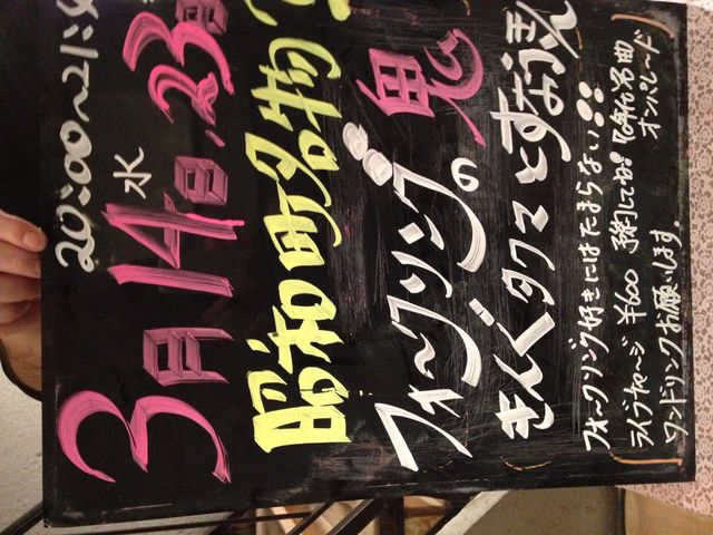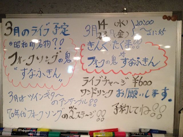 告知が遅れてスイマセン 明日やります 今回はフォークソングの鬼 すなふきん がデュオでのLive チャージ600円とドリンク1杯以上注文でよろしく