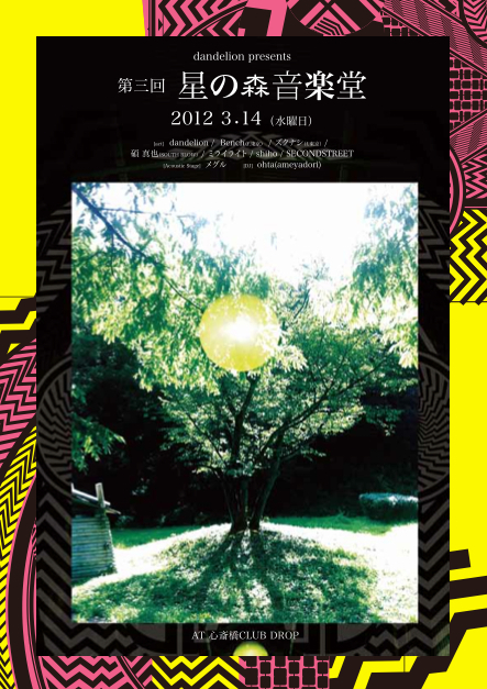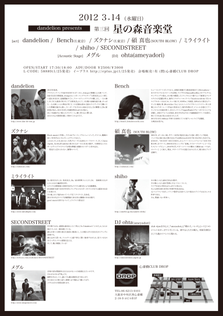 ※dandelion(ex.SQUEEZE!!)の賢輔が、この日でバンドを脱退します。 ミライライト(ex.ムラマサ☆)も出演! 2012年3月14日(水曜日) title:dandelion presents 第三回 星の森音楽堂 [act] dandelion http://www.dan-de-lion.jp/ Bench(f.東京) http://bench.5studsrecords.com/ ズクナシ(f.東京) http://zukunasi.com/ 碩 真也(SOUTH BLOW) http://southblow.info/ ミライライト http://www.mirailight.com/ shiho http://ameblo.jp/mynameis-shiho/ SECONDSTREET http://www.audioleaf.com/se