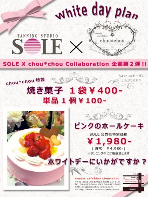 ホワイトデーに向けてSOLEとcho*choがスイーツコラボ! 通常4980円のピンクホールケーキが1980円にて! タンニング中にケーキがデリバリーできますのでよろしければ是非! また今回特別にcho*cho特製クッキーも店頭販売しております。 単品:1個100円 5個入り:400円 ☆詳しくはこちらまで☆ sweets cafe&bar chou chou 〒542-0081 大阪府大阪市中央区南船場2-3-4 日宝長堀ビル 2F TEL.06-4963-3614 FAX.06-4963-3615