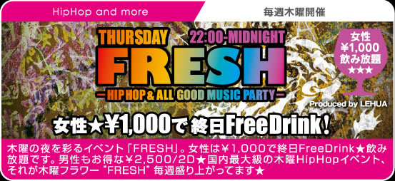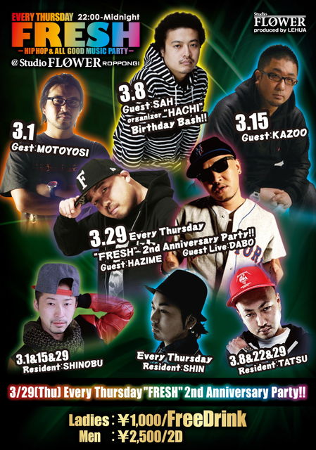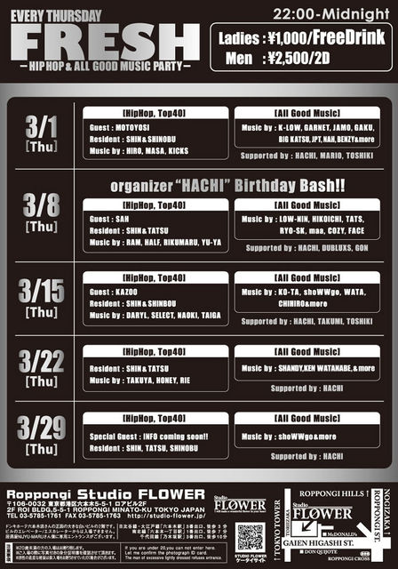 管理人様書き込み失礼します。 3月15日(木)は六本木Flowerにて『FRESH』!! ---------■□■□■□■□■□■□■□■--------- ★ゲストでの入場方法はコチラ★ エントランスにて 『シノブのゲストでフレッシュ』 と、伝えて頂ければ [ゲスト料金] 男性2000円 2Drink+2Shots 女性1000円 飲み放題+Mix CD or シャンパンチケット にてご入場頂けます。 ---------■□■□■□■□■□■□■□■ --------- 六本木 Studio FLOWERにて、HipHop Party『FRESH』が開催されます!! 毎回500人規模で盛り上がりを見せる、今や都内