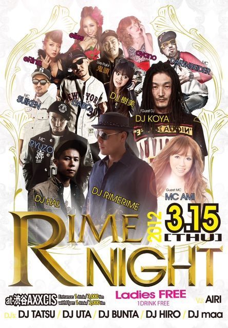 3/15(木) RIME NIGHT@axxcis DJ: RIMERIME / DJ HAL / DJ 樹美 GUEST DJ:KOYA MC: DABO / DARTHREIDER / SUIKEN / RYUZO LIVE PAINT: 鬼頭 GUEST MC: MC AMI と平日では考えられない超豪華PARTYです!! なんとこのPARTYゲスト入場で女性FREE & 1D付きで入れます★ ☆ゲスト入場方法です☆ axxcisエントランスで 『ボーゲンのゲストでアクシス』 と言っていただければ ゲスト料金 女性 FREE & 1D付き 男性 1500/1D にてご入場出来ます! 個別の確実なゲストご用意できますのでご希望