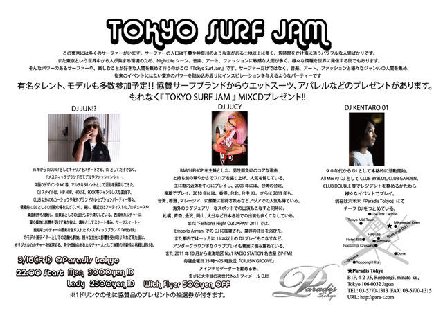 この東京には多くのサーファーがいます。サーファーの人口は千葉や神奈川のような海がある土地以上に多く、皆時間をかけ海に通うパワフルな人間ばかりです。また東京という世界中から人が集まる環境のため、Clubシーン、音楽、アート、ファッションに敏感な人間が多く、様々な情報を世界に発信する街でもあります。そんなパワーのあるサーファーや、楽しむことが好きな人間を集めて行うのがこの『Surf Jam Tokyo』です。サーファ