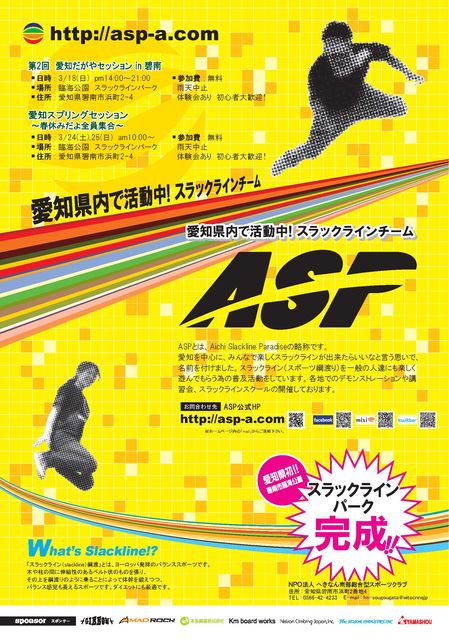 愛知県でスラックラインをするライナー達の顔合わせセッションしませんか?? スラックラインに関わってる人なら誰でも参加OK 新しくスラックラインを始めたい人も、ちゃんと教えますよ〜。 どしどし参加して下さい。 場所 碧南市 臨海公園 スラックラインパーク 愛知県碧南市浜町2−4 日程 3月18日(日) 時間 14:00〜21:00(いつの時間からでもOK!) ☆ミニセッションではGIBBONさんからの商品有り!!! 16:00ごろ〜 ☆体験会も同時開催! 14:00〜 ちなみに、県外からの参加もOKです