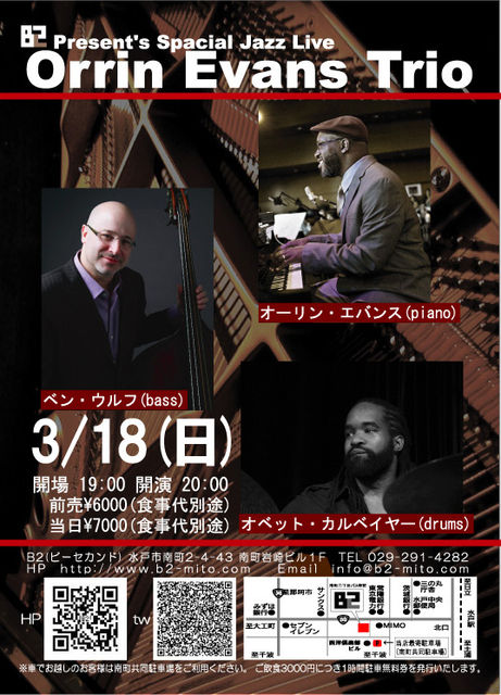 管理人さまへ ライブ告知させてください。 3/18(日) 『オーリン・エバンス Trio』 Open 19:00 Start 20:00 Music Charge 前売 \6000+飲食代/当日 \7000+飲食代 [メンバー] オーリン・エバンス(ピアノ) ベン・ウルフ(ベース) オベット・カルベイヤー(ドラム) ●ご予約は B2(ビーセカンド) 茨城県水戸市南町 029-291-4282 または info@b2-mito.com 私にメッセージをいただいても 対応させていただきます。 [出演者プロフィール] オーリン・エバンス Orrin Evans : piano 1975 年、フィラデルフ