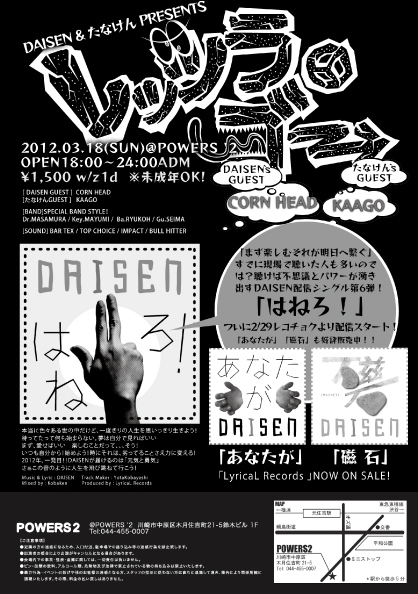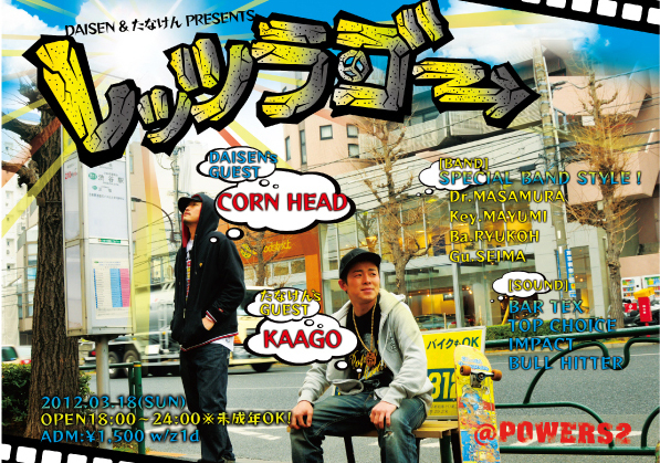 3/18(日) -DAISEN&たなけんPRESENTS- 「レッツラゴー!」 at.POWERS'2 (川崎市元住吉) 18時〜24時☆未成年可☆ ★SPECIAL BAND Dr.MASAMURA Key.MAYUMI Gu.SEIMA Ba.RYUKOH ★DAISEN'S GUEST CORN HEAD ★たなけん'S GUEST KAAGO ★SOUND BAR TEX TOP CHOICE IMPACT BULL HITTER INFO: TEL 044-455-0007 E-MAIL powers_two@ybb.ne.jp HP http://www.powersbar.com/ 〒211-0021川崎市中原区木月住吉町21-5 東急東横線 元住吉駅からオズ通りを 綱島街道方面へ。綱島街道を渡って 直進。ミニストッ
