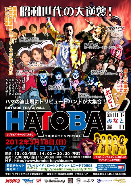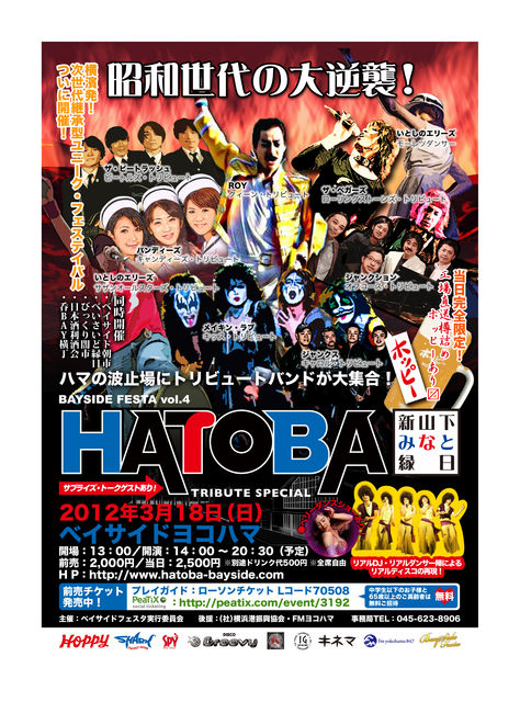 2012/ 3/18 (Sun) “HATOBA” 〜Tribute Special〜 Bay Side Festa vol.4 <新山下みなと縁日> http://www.hatoba-bayside.com/ 開場:1300 開演:1400(〜2030) ベイサイドヨコハマ 横浜市中区新山下3-4-19 Tel/Fax:045-350-8089 当日:\2,500(要別1D) 前売:\2,000(要別1D) ・手売チケット ・ローチケ(L: 70508 ) ※中学生以下は同伴者様1名につき2名入場無料。 《RED STAGE(メイン)》 70s&80s洋・邦ミックスのトリビュート系ユニットによるライブ。 ↓出演予定↓ 〔MC〕 栗原治久(FMヨコハマ)