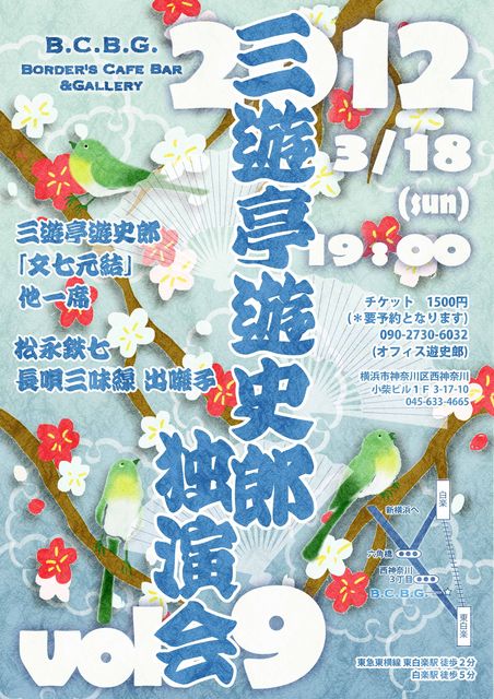 東白楽のカフェ&バーBCBGの会、第九回目です。 今回のネタは「文七元結」他一席、 松永鉄七さんの長唄三味線、生の出囃子とともにお楽しみください。 7時開演 1500円(要別途飲食代)終演後はそのまま打ち上げとなります。 みなさまのご参加をお待ちしております。