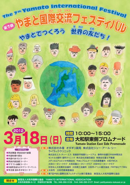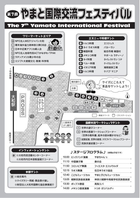 皆様こんにちは。 来る3月18日の日曜日、私の地元の大和市で国際フェスティバルが行われます。私はこのイベントの実行委員をしております。 場所は相鉄と小田急が交差する大和駅前の広場です。入場は無料(ただし国際料理店での食事は別途料金がかかります)で時間は10:00〜15:00に開催します。 このフェスティバルは大きく分けてステージ・ワークショップ・国際料理店・フリーマーケットの4つのセクションで催し物を開催します。 私が担当しているステージではメキシコのマリアッチ楽団の生演奏を筆頭に、韓国の民族楽器演奏、ラオス舞