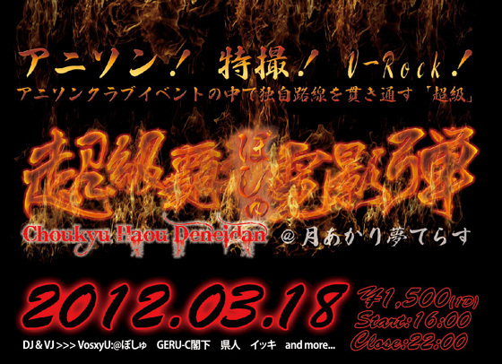 アニソン!特撮!V-Rock! アニソンクラブイベントの中で独自路線を貫き通す「超級」 燃え上がれ!! MOTTO! MOTTO! 熱い魂を呼び覚ませ!! 2月、3月の誕生日が多い超級DJ陣! という訳で、今回はスペシャルゲスト「Mura」を迎え 「超級覇王ぼしゅ電影弾」 ここに!ドドドーーーん!っと開催決定!! 名前も内容もいつもと違う!! さあ、今回はお祭りや!! 普段見せない、スペシャルゲスト「Mura」の熱い選曲は、超必見!! ヘドバン、モッシュ、ダイブ! 往年の名曲から最新曲まで流れるそ