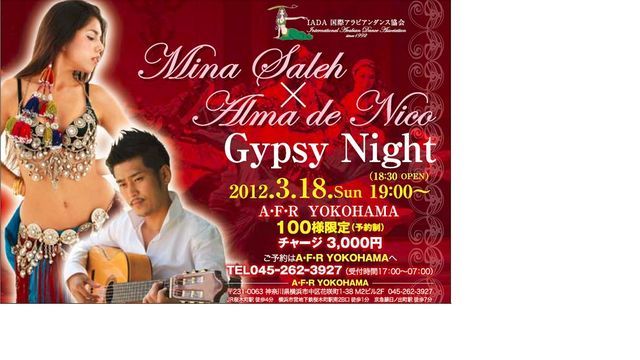 管理人様、告知よろしくお願い致します。 ミーナ・サレー(Mina Saleh)ショー映像 Nico(アルマデニコ)ライブ映像 ペルシャの舞姫、ミーナ・サレーとジプシーキングスをも唸らせる歌い手Nicoが 初めてコラボするショーが今月、18日横浜で開催されます。 【date】2012.3.18(sun) 【place】AFR横浜 http://www.asian-file.com/ 【open】18:30 【start】19:00 【charge】3,000円 ※100名限定のライブ 【予約・問い合わせ】tel 045-262-3927 (AFR) 詳しくはミーナ・サレーさんが主宰する国際アラビアンダンス協会のホームページhttp:/