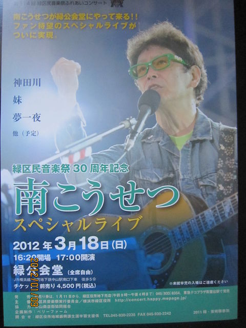 緑区民音楽祭実行委員会からふれあいコンサートのお知らせです。 南こうせつスペシャルライブ 開催日時 3月18日(日) 開場16時20分 開演17時 開催場所 緑公会堂(中山駅南口より徒歩5分) チケット 前売り4500円(全席自由) 1月11日より、緑区役所地下売店、東急テコプラザ青葉台駅にて発売