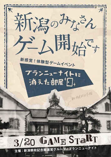 ブランニューナイトに消えた部屋 ゲームの目的は、館内図にはない消えた部屋を見つけ出すことです 洋館に散りばめられた謎を全て解き明かし、 あなたは消えた部屋へ辿り着けるでしょうか 今回は重要文化財の「新潟県政記念館」とコラボして、 雰囲気たっぷりの洋館でみなさんに謎解きをしてもらいます! 初対面の仲間と協力してクリアを目指してください! 日時 2012年3月20日(火・祝) 第一公演 13:00〜15:00 第二公演 16:00〜18:00 ※一日二回公演で、好きな時間を選べます