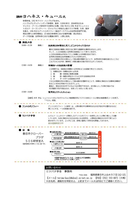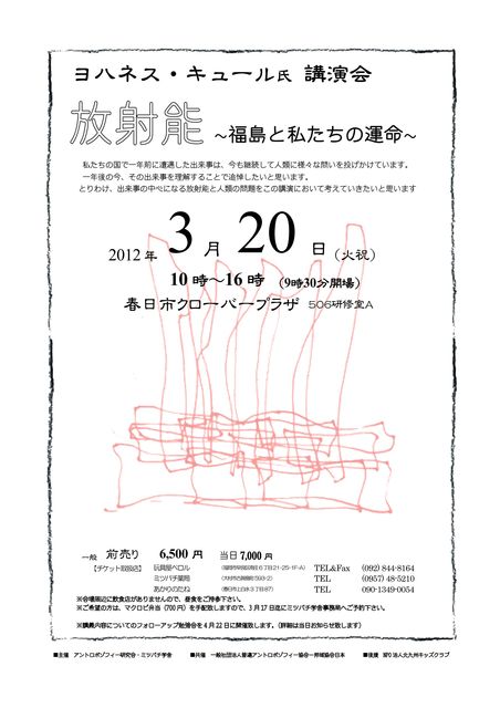 私がアントロポゾフィーを学んでいるミツバチ学舎が主催で ゲーテアヌム自然科学部門代表のヨハネス・キュール氏の 講演会を行います。 東京の普遍アントロポゾフィー協会が招聘しているのですが、 九州にも来て頂けるようになりました。 このミツバチ学舎は、昨年の3.11に起きた原発の問題を 発端にアントロポゾフィーの視点から個人の取り組みや 生き方へのヒントを探ることを目的に発足しました。 ■ゲーテアヌム自然科学部門代表 ヨハネス・キュール氏講演会■ 「放射能 〜福島と私たちの未来〜」 【日時】2012年3月20日(火
