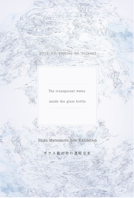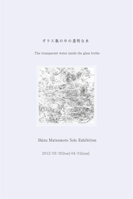 本日より4月1日までの開催となっております。 是非お立寄りください。 __________ 2012/03/20[tue] -04/01[sun] Shizu Matsumoto Solo Exhibition -The transparent water inside the glass bottle- ■紙にペンで描いたドローイング作品を中心に展示いたします。 カフェで展示するため、ワンドリンクオーダーお願いいたします。 お店ではときたまイベントや講演会等開催される場合がございます。 お知らせはブログやFace book、twitterで随時更新いたします。 ■http://shizu-ma.blogspot.com/ ■問い合わせ:shizu729@g