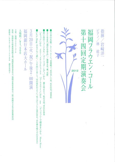 N穣の参加しているフラウエン・コールの演奏会があります。 福岡フラウエン・コール 第十四回定期演奏会 3月20日(火・祝) 14時開演 福岡銀行本店大ホール 1500円 *** 6月3日北天神CBに出演?