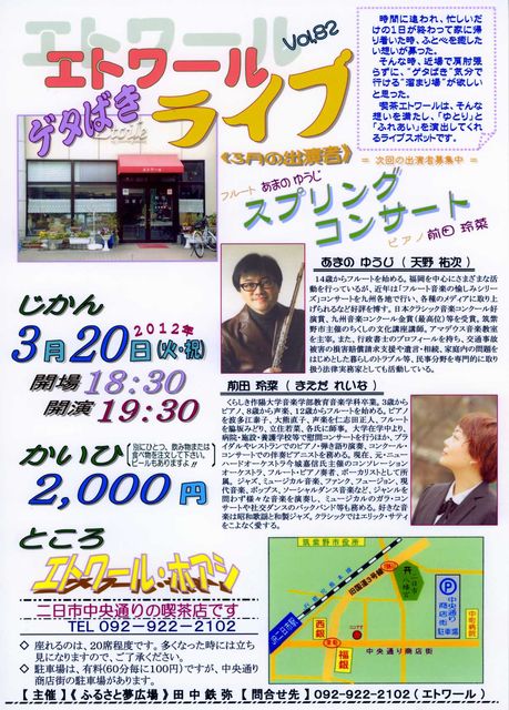 このエトワール“ゲタばき”ライブは、人と人の“出遭いと繋がり”作り出す“溜まり場” です。ただ音楽を聴くだけではなく、音楽を通して共に参加しお互いのコミュニケーション を大切にしたいと思っています。 音楽を難しく考えずに、気取らず!構えず!“ゲタばき”気分で気楽にお越しください。 《 日 時 》 3月20日(火・祝) 開場;PM6:30 / 開演;PM7:30 《 出 演 》 = スプリングコンサート = 〔 フルート演奏 〕 あまの ゆうじ ( 天野 祐次 ) 〔 ピアノ伴奏 〕 前田 玲菜 ( まえだ れいな