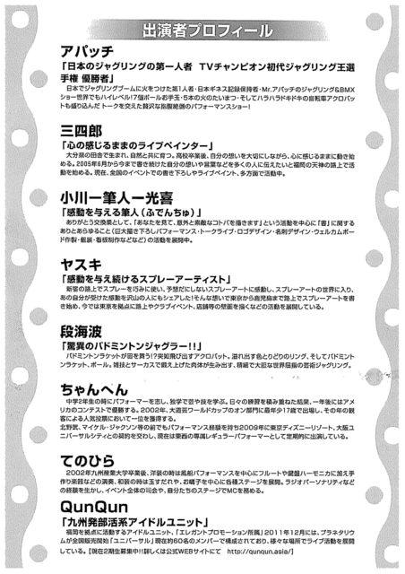 2012.3.20(火祝) はなわちえ 九州新幹線全線開業 JR博多シティ開業一周年記念 「福岡春祭」 場所:JR博多駅前広場(博多口) 時間:17:00〜17:45 料金:無料 出演: TAO Yellow / 和太鼓 RIKKI / vocal はなわちえ / 津軽三味線 柳井麻貴 / 箏