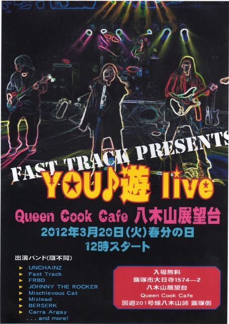 八木山展望台野外ライブ第2弾 FAST TRACK PRESENTS YOU♪遊 live 2012年3月20日(火曜)春分の日 祝日です 12:00スタート 入場無料フリーライブ 出演 1 Mischievous Cat 12:00〜12:40 2 渦 12:50〜13:30 3 mislead 13:40〜14:20 4 JOHNNY THE ROCKER 14:30〜15:10 5 BERSERK 15:20〜16:00 6 Carra Argay 16:10〜16:50 7 UNCHAIN’Z 17:00〜17:40 8 Fast Track 17:50〜18:30 9 FRBD