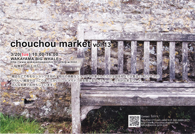 chouchou ! market vol.13 開催決定! 以下HPより引用 ///// 全国から『とっても素敵なショップ』が大集合! 今回はなんと過去最大の150ブース ぜひ皆さまのお越しをお待ちしています。 会場は駐車場が少ないため、公共交通機関をご利用になるか なるべく乗りあわせてお越しいただきますようお願い致します。 近隣にお住まいの方やお店に迷惑にならないようご協力お願い致します。 http://www.chouchoumarket.net/