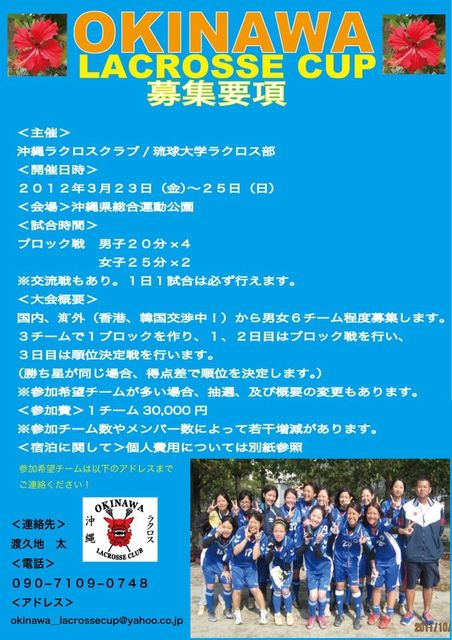はいさい 沖縄CUP2012実行委員会より リゾートラクロスのお知らせになります。 ご興味ある方是非ともリゾートラクロスでエンジョイしませんか〜 個人参加、団体参加いずれもOKです。 □ 沖縄CUP 2012 □ 【概要】 ラクロス好き・地球好き・旅好き・音楽好き・お酒好き集まれ!! 「沖縄CUP2012」とは海と沖縄とラクロスを愛する人々のフェスティバルです。 沖縄でラクロスを通じて環境・スポーツ・平和を体で感じながら人間とスポーツのより根源的なかかわりを探る試みにしたいと考えています。
