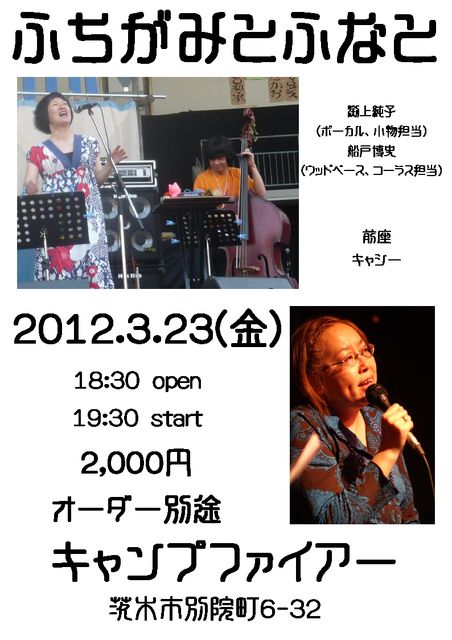 キャシーが、またまたキャンプファイアーに 大物ミュージシャンを拉致します。 今回は、なんと「ふちがみとふなと」です。 もう絶対楽しいに決まってます。 キャシーが一番楽しんでしまっているかも知れませんが。 キャンプファイアーは狭い店なので、ご予約が肝心! 早い者勝ちでSOLD OUTが予想されます。 mixiメッセージで、「キャシー」または「ぜりしぃ」まで ご予約人数をお知らせください。 これはmixiキャシーコミュに参加されている方への特典ですぜ!