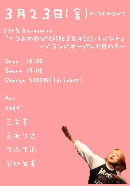 3月23日(金) 谷紗矢香presents 『かつおの遊び場移転3周年記念イベント』 〜グランドオープンの日の巻〜 大阪・なんば かつおの遊び場 http://mixi.jp/view_community.pl?id=2812167 Open 18:00 Start 19:00 Charge 2000円(1drink付) Act 紗代 三宅芳 高木りさ てふてふ 谷紗矢香 *** かつおの遊び場移転3周年の日に イベントを任せてもらいました* かつおさんとこで育ったミュージシャンや かつおさんが思い入れがあるであろうミュージシャン、 そしてわたし自身が一緒にやってみたいミュージシャン