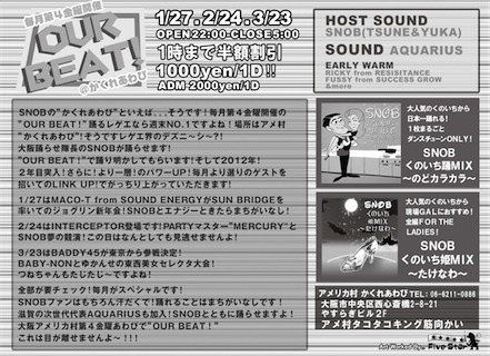 告知失礼します。 SNOBの”かくれあわび”といえば。。。 そうです!毎月第4金曜開催の”OUR BEAT!” 踊るレゲエなら週末NO.1ですよね! 場所はアメ村”かくれあわび”! そうですレゲエ界のデズニ〜シ〜?! 大阪踊らせ隊長のSNOBが踊らせます! ”OUR BEAT!”で踊り明かしてもらいます! そして2012年!2年目突入! さらに!より一層!のパワーUP! 毎月より選りのゲストを招いての LINK UP!でがっちり上がっていただきます! 3/23はBADDY45が東京から参戦決定! BABY-NONとゆかんせの東西美女セレクタ大会!