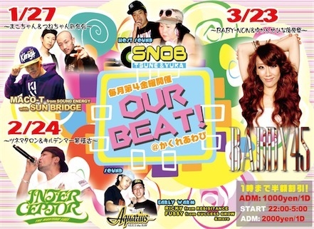SNOBの”かくれあわび”といえば。。。 そうです!毎月第4金曜開催の”OUR BEAT!” 踊るレゲエなら週末NO.1ですよね! 場所はアメ村”かくれあわび”! そうですレゲエ界のデズニ〜シ〜?! 大阪踊らせ隊長のSNOBが踊らせます! ”OUR BEAT!”で踊り明かしてもらいます! そして2012年!2年目突入! さらに!より一層!のパワーUP! 毎月より選りのゲストを招いての LINK UP!でがっちり上がっていただきます! 3/23はBADDY45が東京から参戦決定! BABY-NONとゆかんせの東西美女セレクタ大会! つねちゃんもたじた