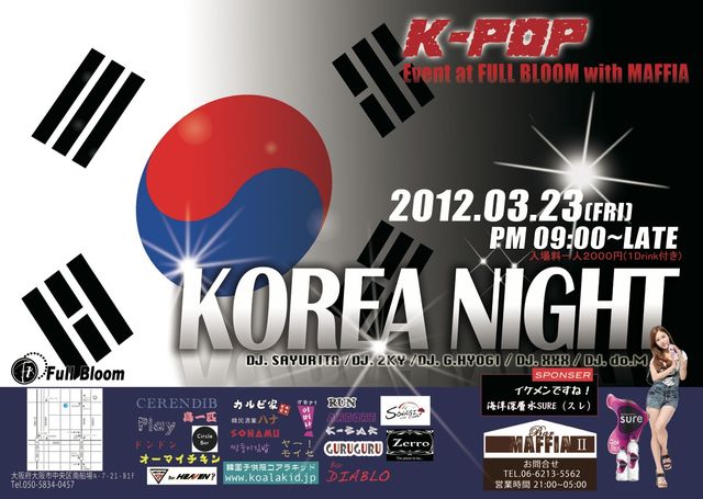 今回はいつもより早く次のKOREA NIGHTの日程が決まりました〜!! 今年に入り2度目のKOREA NIGHT です☆ 前回と同じく今回もめちゃくちゃ盛り上がりましょう!! 4月はイベント予定がないので、ぜひ参加して下さいね♪ ー日程ー 3月23日(金曜日) 21時〜翌朝5時 南船場の「Full Bloom」を貸し切って、大阪にある全ての韓国BARなどが力を合わせ第12回大阪KOREA NIGHTを開催します!! 毎回、300人くらいもの人達に参加して頂いている関西で1番多くの韓国人が集まるKOREA NIGHTで、たくさんの人達と一緒
