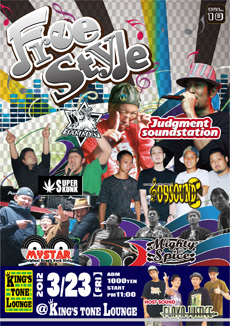 2012年 3月 23日 金曜日 ☆★☆★☆★☆★☆★☆★☆★☆★☆★☆ 〜FLAVA JUSTICE present's〜 【FREE STYLE vol.18】 @KING'S TONE LOUNGE 06-6243-7610 大阪市中央区西心斎橋 1-8-16 中西ビル303 OPEN.23:00 ADM.1000YEN ☆★☆★☆★☆★☆★☆★☆★☆ ♪♪SP GUEST♪♪ 【Crush from Judgment Sound Station】 http://m.mixi.jp/view_community.pl?id=2393446& ♪♪SOUND♪♪ ◆MA-BO from JAMMYS http://mixi.jp/view_community.pl?id=1138015& ◆09SOUND http://mixi.jp/view_community.pl?id=3459418& ◆