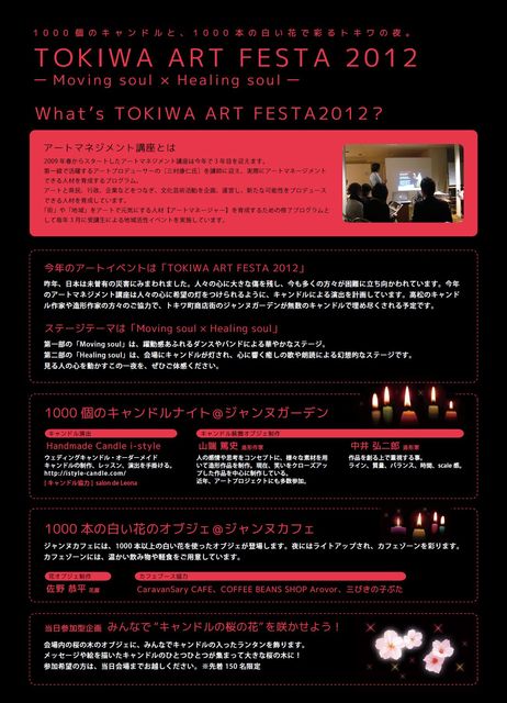 優華の受験が終わり、華〜puspa〜始動です☆ 香川県アートマネジメント講座2011終了イベント 【TOKIWA ART FESTA 2012】「Moving soul × Healing soul」 場所:香川県高松市常盤町商店街 ジャンヌガーデン 入場無料 1000個のキャンドルと、1000本の白い花で彩るトキワの夜。 ☆第一部「Moving soul」16:00~18:00 躍動感あふれるダンスやバンドによる華やかなステージ ・Drakskip ・華〜puspa〜 ・Belly Dance Studio Lulu ☆キャンドル点灯セレモニー18:00~ ☆第二部「Healing soul」18:15~20:00 会場に