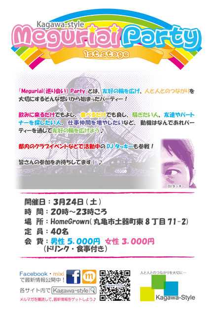 3/24に香川スタイルさんのイベント企画でまたまたパーティーを主催します。 いちおー気軽なパーティーということで、知り合いを増やしたい方や、ちょっとした出会 いがほしい方、イベント好きな方はよければきてくださーい。 いちおー香川スタイルさんもメンバーを集めるということで、今回ぼくらが募集してい 人数は 男性5名 女性10名 です。 値段は 男性5000円 女性3000円 でーす。 いちおー先着順になると思うんでおはやめにご連絡お願いしまーす。