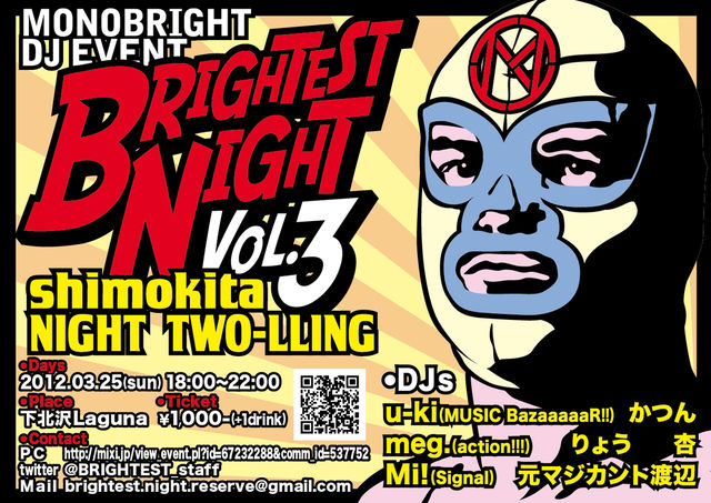 管理人様 スペースお借りします。 ★3/17 タイムテーブル更新★ おはようございまぁ〜す!! お待たせしました! 前回開催から約5ヶ月、 BRIGHTEST NIGHTの第三弾開催決定!! Vol.1↓ http://mixi.jp/view_event.pl?id=60729959&comm_id=537752 Vol.2↓ http://mixi.jp/view_event.pl?id=64058057&comm_id=537752 "DOES"と『ACMEが来たりて笛を吹く』 "THE ラブ人間"と『ブラ人間』 "四星球"と『ブラタマリ』 "bloodthirsty butchers"『BRIGHT THIRSTY BUTCHERS』 3月には自主企画の『五人囃子』を開催と 2012年前半