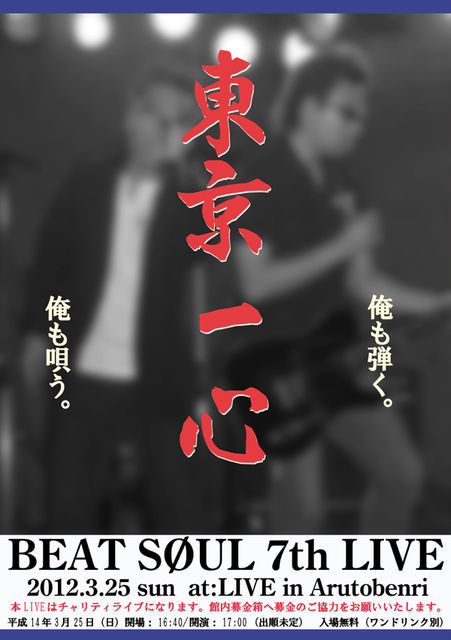 いつもコミュより多数のみなさまのLIVEご来場本当にありがとうございます。 吉川晃司,COMPLEX,BOOWYカバーバンド BEAT SφULと申します。 http://music.dragon-1.com/ この度、私ども「BEAT SφUL」は東日本大震災チャリティライブ ==BEAT SφUL 7thLIVE -ALL COMPLEX COVERED- 『東京一心』== を開催させていただくことになりました。 主旨や経緯等は日記に詳しく(?)書かせていただいておりますので http://mixi.jp/view_diary.pl?id=1825075043&owner_id=1738666 こちらをご参照ください