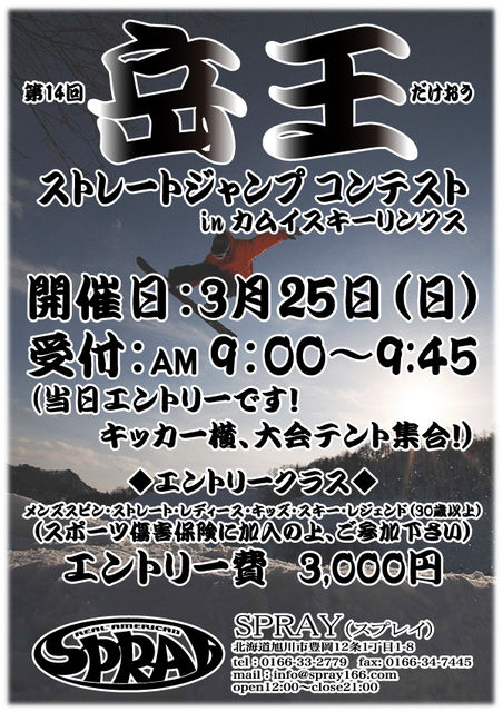 【岳王】今年もやっちゃいます 3月25日(日) 受付 9時〜9時45分 (キッカー横大会テント) エントリー費 3000円 エントリークラス メンズスピン・ストレート・レディース・キッズ・スキー・レジェンド