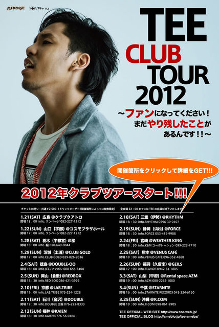 2012/03/25(土) 『TEE CLUB TOUR』 〜CLUB TOUR2012 in.沖縄〜 日時:03月25日(土) OPEN:19:00〜 会場:沖縄@R.COM 住所:〒900-0015 沖縄県那覇市久茂地3-11-7 新星産業ビル4F 料金(税込):ADV/2,500 (共に入場の際に1ドリンク代500円が必要となります) [お問合せ] ・R.COM_098-861-9905 出演:(※順不同) ■LIVE:TEE ■Guest:N.O.B.U!!! from.宮崎etc...