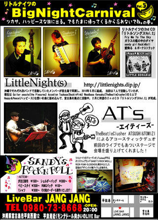 タイトル通り、アコーディオンのツカサちゃんがお仕事の都合により本島へ転勤となりました 宮古島からツカサちゃんが消える?のは寂しいけど(笑)でも大丈夫〜〜〜♪ちょくちょくライブしに帰ってくるそうなのでリトルナイツ解散ライブではないですよ(笑) ただ、しばしのお別れライブ?? みなさん25日はツカサちゃんを泣かしにライブに行こうぜ〜 場所=JANG JANG(モンテドール向かいのLIVE Ber) 入場料=1000円(1Drink付き)