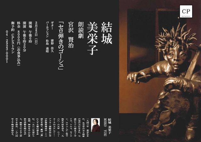 (満席) ★結城美栄子 音楽と朗読の世界 「KENJI WORLD」 日時:3月25日(日) 開場18:00 開演18:30 会場:CPレストラン 料金:8,000円(ディナー込) 要予約:CPレストラン 04-2923-0001 info@r-cp.com