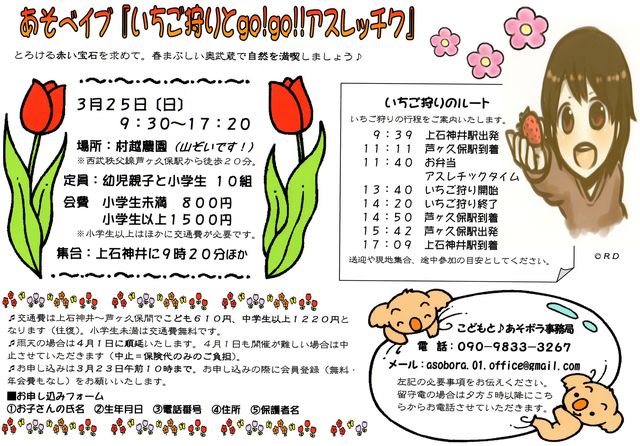 春休みにビタミンたっぷりのいちごを食べにいきませんか。 中野駅 9時 大和三丁目付近9時15分 新青梅街道武蔵台小学校前9時25分 新青梅街道(井草付近)ガスト前9時半 バスをレンタルしています。 スケジュール 1、いちご狩り 2、出雲伊波比神社参拝 3、ゆずの里おたかで昼食 解散は4時半から5時の予定です。 参加費 小学生以上3800円 幼稚園児 3200円 幼稚園未満2400円 0歳児 無料 ●全行程禁酒禁煙です ●お子様だけのご参加はできません 1軒におひとり