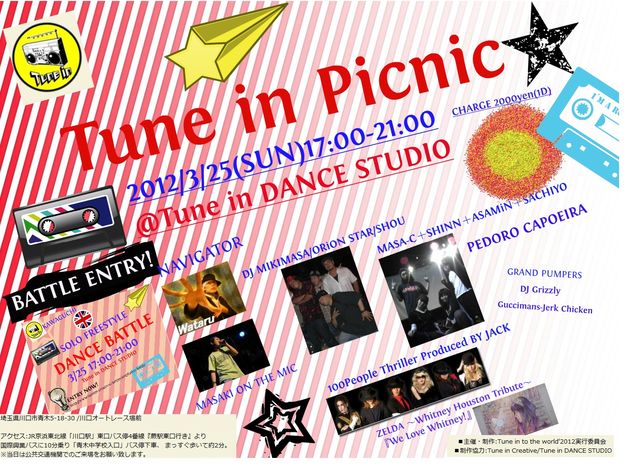 『3/25 Tune in Picnic '2012』 ★ 2012/3/25(SUN)17:00-21:00 @Tune in DANCE STUDIO(クロスロード39) http://mixi.jp/view_community.pl?id=2854320 http://www.tunein-creative.com/event/ もっと自由なスタイルで、皆で楽しみたい!! 2008年よりスタートしたHappy Groovy Party♪「Tune in」 多彩なDance&Live、ストリートパフォーマーが埼玉川口に集合。 「皆で作る春フェスParty!!」をお送りします!! >>> Enjoy Happy Groovy Spring Picnic!!♪♪ ■CHARGE WF/前売:2000YEN - 1D付 DOOR: 2500YEN - 1D付 ※